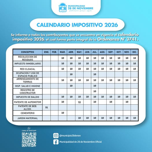 La Municipalidad de 28 de Noviembre informó a la comunidad que ya se encuentra vigente el Calendario Impositivo 2026, aprobado mediante la Ordenanza N° 3741, el cual establece los plazos y vencimientos correspondientes al cumplimiento de las distintas obligaciones tributarias municipales.
