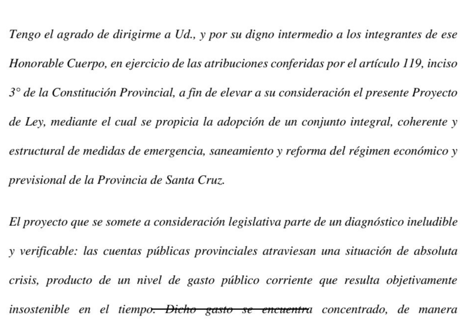 El texto, invocando el artículo 119 inciso 3° de la Constitución Provincial, parte de un diagnóstico crítico: sostiene que las cuentas públicas atraviesan una “situación de absoluta crisis” producto de un gasto corriente “objetivamente insostenible”, concentrado principalmente en el pago de salarios y jubilaciones.