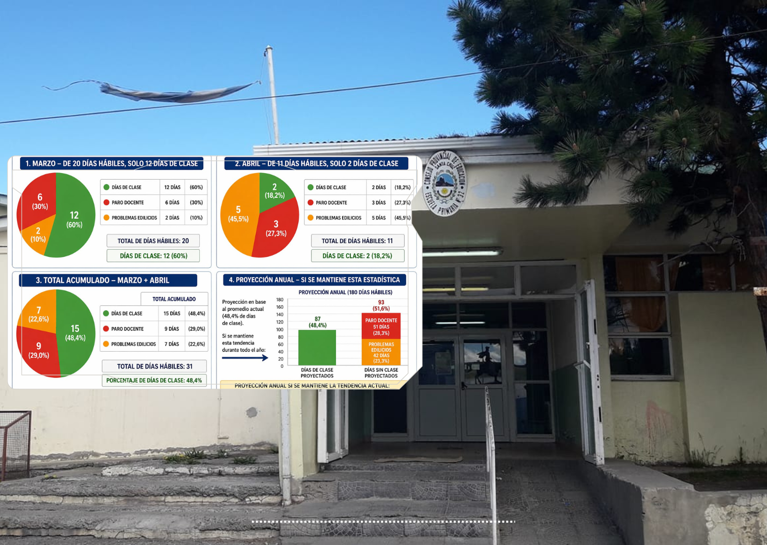 De acuerdo a los datos relevados por el propio padre, durante el mes de marzo se registraron 20 días hábiles, de los cuales 6 fueron afectados por medidas de fuerza y 2 por inconvenientes edilicios. Esto redujo el dictado real de clases a solo 12 jornadas.
