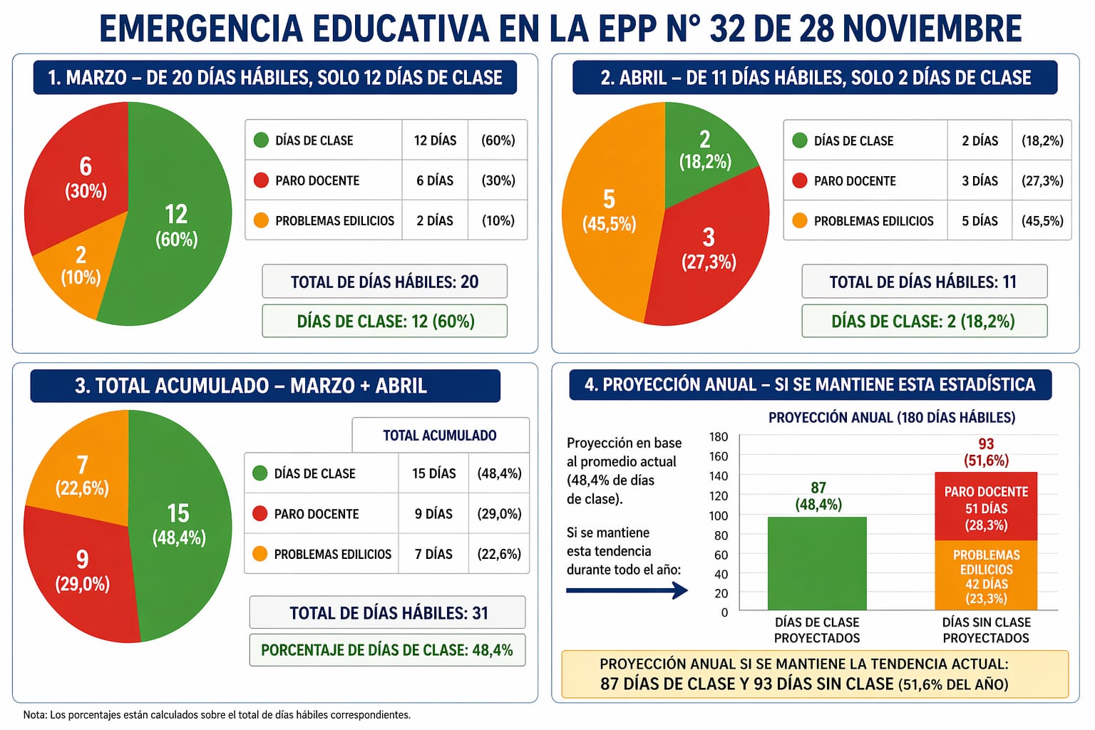 La situación se agrava en abril, donde sobre 11 días hábiles contabilizados hasta el momento del informe, se registraron 3 días de paro y 6 jornadas con problemas edilicios, dejando apenas 2 días efectivos de clases.